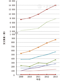 然而,随着我国经济的持续发展以及国家对基础科学研究的持续投入,我国呼吸病学的研究也取得了可观的进步,发表论文的数量有了长足的发展(图2)。2009—2013年,全世界呼吸领域发表的SCI论文总数只增加了1.24倍,而中国增加了1.87倍;具体到各个疾病类型,全世界分别只增加了1.00~1.50倍,而中国则增加了1.37~3.07倍;全世界增长最快的是慢阻肺和哮喘的研究,均只增加了1.50倍左右,而中国增长最快的肺癌和慢阻肺,分别增长了3.07和2.72倍。值得一提的是,我国呼吸疾病研究的论文质量取得了很大提高,近年来呼吸领域的中国学者已在New Engl J Med、Lancet、Ann Inter Med、BMJ、Nature Med、Nat Immunol、Am JResp Crit Care Med、Nat Commun、Proc Natl Acad Sci U S A等国际顶级期刊发表论文几十篇。