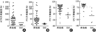 所有95例患者均接受了HDDST。库欣病组服药前后PTC水平分别为(880±358) nmol/L与420(98,477) nmol/L,服药后PTC水平较服药前平均下降约60%,85例库欣病患者中HDDST阳性者67例(阳性率79%)。EAS组服药前后PTC水平分别为1 527(1 106,4 657) nmol/L与1 468(550,5 334) nmol/L,服药后PTC较服药前仅平均下降约12%,10例EAS患者中HDDST阳性者2例(阳性率20%)。两组比较服药前后PTC值及PTC下降幅度的差异均有统计学意义(均P<0.05)。两组服药前后PTC及UFC下降幅度见图1C,图1D。在85例接受HDDST的库欣病患者中,过夜HDDST 44例,标准HDDST 41例。标准HDDST中若以服药后PTC降低50%作为诊断指标,其阳性率为76%,若以服药后UFC下降50%作为诊断指标,其阳性率为93%。过夜HDDST若以服药后PTC降低50%作为诊断指标,其阳性率为64%。