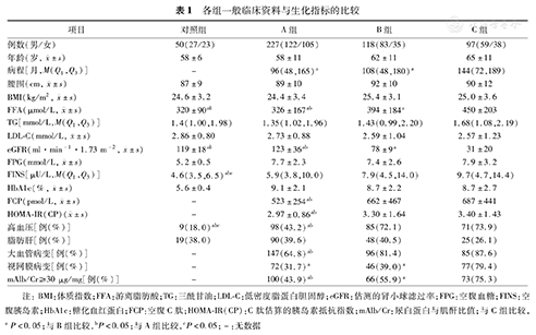 注:BMI:体质指数;FFA:游离脂肪酸;TG:三酰甘油;LDL-C:低密度脂蛋白胆固醇;eGFR:估测的肾小球滤过率;FPG:空腹血糖;FINS:空腹胰岛素;HbA1c:糖化血红蛋白;FCP:空腹C肽;HOMA-IR(CP):C肽估算的胰岛素抵抗指数;mAlb/Cr:尿白蛋白与肌酐比值;与C组比较,aP<0.05;与B组比较,bP<0.05;与A组比较,cP<0.05;-:无数据