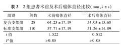 对2组患者术前、术后瘤体大小分别进行测量,手术前后2组患者瘤体大小比较,差异均无统计学意义(均P>0.05)(表3)。