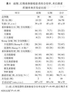 为了研究术者经验与临床疗效的关系,将124例按研究的中位时间先后分成两组,每组约24个月,分别比较了由同一术者开展的内镜手术前、后期两阶段之间垂体腺瘤全切率、激素控制率、并发症发生率和手术时间的差异,见表1。