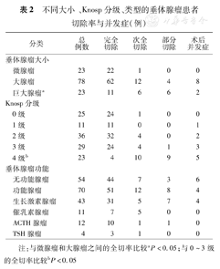 垂体腺瘤临床疗效主要取决于肿瘤的大小、侵袭程度以及病理分型。国内习惯于按肿瘤的直径将垂体腺瘤分为微腺瘤(<1 cm),大腺瘤(>1 cm)及巨大腺瘤(>3 cm),本结果表明,巨大腺瘤的完全切除率明显低于微腺瘤和大腺瘤,而微腺瘤和大腺瘤的全切率差异无统计学意义。对于垂体腺瘤的侵袭程度,本研究显示,当Knosp 4级时肿瘤全切率明显下降,并且与0~3级的全切率差异有统计学意义。巨大腺瘤或Knosp 4级垂体腺瘤侵袭性强,由于侵及海绵窦及颈内动脉,经蝶入路切除仍较困难,切除时不可强求,达到手术目的即可,以免出现严重的并发症。近来对于Knosp分级≥3级或者Hardy-Wilson分级≥C级的垂体腺瘤,有学者提出"非典型性垂体腺瘤"或"侵袭性肿瘤"的说法。非典型性垂体腺瘤多为无功能腺瘤,虽为良性[5],但呈侵袭性增长,生长速度更快、更易复发,在肿瘤切除上术者大都持保守态度,多以术后辅助药物、放疗手段治疗为主,全切率相对较低。