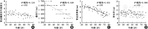 3.肾长度及肾宽度:总的组间差异有统计学意义(F=5.93,P<0.01)。两两组间比较21~40岁年龄组与41~60岁年龄组组间差异无统计学意义,但61~80岁年龄组与21~40岁年龄组和41~60岁年龄组组间差异均有统计学意义(均P<0.05)。肾长度与年龄间存在负相关(r=-0.29,P<0.01)(图1D)。肾宽度比较中,61~80岁年龄组略高于其他两组,但组间差异无统计学意义(F=1.81,P=0.17)(表3)。