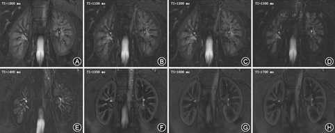 使用东芝3.0 T磁共振扫描仪以及体部相控阵线圈,附加呼吸门控装置,患者取仰卧位,头先进。反转恢复序列(inverse recovery, IR)、反转恢复时间(time of inversion, TI)的选取包括冠状位1 000、1 100、1 200、1 300、1 400、1 500、1 600、1 700 ms,在IR序列扫面前先行3个不同方向的定位像扫描,确定扫描范围。再行未施加IR的常规冠状位稳态自由进动(steady-state free precession,SSFP)磁共振成像扫描,再次确定有无肾脏疾病及定位使用。SSFP扫描参数:重复时间4.8 ms,回波时间2.5 ms,层厚3 mm,层间距0,层数36~48,加速因子2,激励次数1 ,矩阵256×256,视野320 mm×320 mm~400 mm×400 mm,依据个人身材而定,总扫描时间约20 min。