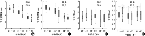 3个年龄组组间差异有统计学意义(F=104.23,P<0.01),且与年龄负相关(r=-0.79,P<0.01)(表2)。男女肾皮质厚度对比中,男性略>女性,但差异无统计学意义(t=1.28,P=0.20)。左右肾皮质厚度对比,右侧肾皮质厚度为(5.34±0.71)mm,左侧肾皮质厚度为(5.33±0.70)mm,左右肾之间差异无统计学意义(t=0.03,P=0.98)(图3)。
