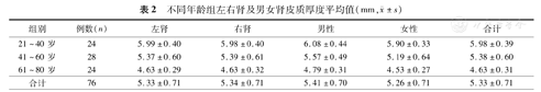 | 41~60岁 | 28 | 10.27±0.73 | 10.07±0.76 | 10.18±0.74 | 5.00±0.54 | 4.80±0.49 | 4.90±0.52 |