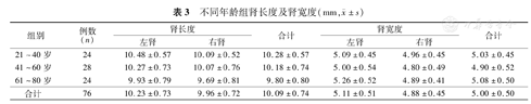 不同年龄组肾长度及肾宽度(mm,