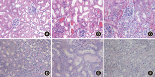 取各组小鼠术后24 h肾组织样本,经4%多聚甲醛固定、脱水、石蜡包埋后,制成石蜡切片,进行HE、PAS染色,初步评价组织病理学情况。此外,在HE染色的肾组织病变严重处,采用Paller氏评分评估肾小管损伤程度,即在400倍高倍镜下,取10个高倍镜视野合计100个肾小管,肾小管明显扩张、细胞扁平(1分);肾小管内出现管型(2分);肾小管官腔内有脱落、坏死的细胞,但未成管型或细胞碎片(1分);上皮细胞颗粒变性(1分);空泡变性(1分);细胞核固缩(1分)。