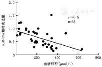 相关性分析显示,小鼠的肾组织miR-26a与SCr呈负相关(r=-0.5,P<0.05) (图2)。