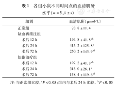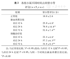 如表1所示,缺血再灌注组术后12、24、72 h的SCr均高于正常组,且术后24 h的SCr高于术后12、72 h(均P<0.05);术后12和72 h之间SCr差异无统计学意义。细胞治疗组术后12、24、72 h的SCr均高于正常组,且术后24 h的SCr高于术后12、72 h(均P<0.05);术后12和72 h之间SCr差异无统计学意义。术后12、24、72 h,缺血再灌注组和细胞治疗组间的SCr差异均无统计学意义(P>0.05)。