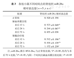 如表3所示,缺血再灌注组术后12、24 h的肾组织miR-26a相对表达量均低于正常组,且72 h肾组织miR-26a高于12、24 h肾组织miR-26a(均P<0.05);细胞治疗组术后12、24 h的肾组织miR-26a相对表达量均低于正常组,且72 h肾组织miR-26a高于12、24 h肾组织miR-26a(均P<0.05);在术后24、72 h,细胞治疗组肾组织miR-26a相对表达量明显高于缺血再灌注组(均P<0.05)。