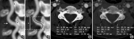 所有患者均经过GE LightSPeed VCT 64排双能CT或者PhiliPs 256i CT进行颈椎增强CT扫描,将增强图像导入Philips IntelliSpace Portal工作站进行三维重建。选取观察组患者扭曲椎动脉相邻节段及对照组各节段的横突孔作为观测对象(图1),采用spline contour作为面积测量工具,在血管窗(窗宽800,窗位300)中测量椎动脉截面积(VA),在骨窗(窗宽1 500,窗位500)中测量横突孔面积(TF) (图2)。为评价单节段内椎动脉扭曲程度,采用屏幕E尺工具测量受试节段上侧横突孔下缘至下侧横突孔上缘的直线距离作为该段颈段长度,测量沿相应节段椎动脉走行所作的曲线长度作为该段椎动脉长度,以后者除以前者作为椎动脉扭曲系数(s)(图1)[5]。以上数据由两名受过培训的临床医师进行测量,数据取两者的均值。如出现两组数据相差超过较小值的5%,则重测数据。