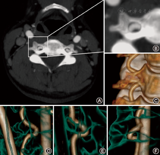 2012年1月至2015年12月在第二军医大学附属长征医院骨科行颈椎增强CT确诊为椎动脉扭曲的患者60例作为观察组,其中男21例,女39例。平均年龄73.3 (45~82)岁。随机抽取排除椎动脉扭曲的其他患者50例作为对照组,男28例,女22例,平均年龄63.5(37~85)岁。其中非特异性头昏头痛19例,帕金森病12例,前循环缺血或梗死10例,后循环缺血或梗死9例。排除先天性横突孔狭窄、椎动脉缺如、椎动脉瘤、颈椎分解不全等畸形及口腔内假体伪影导致测量困难的病例。本研究经第二军医大学伦理委员会批准。
