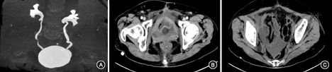 患者女,45岁,因"反复下腹痛2个月"入院。2012年5月22日晨起尝试排尿时突发剧烈下腹部胀痛,伴恶心、呕吐胃内容物、大汗和排尿困难,持续不缓解,有排气排便。外院查体提示下腹部肌紧张、压痛、反跳痛。查血白细胞10.92×109/L,血红蛋白、血小板正常,白蛋白36.5 g/L,血肌酐、淀粉酶正常。腹部超声示腹腔游离液体,最深约8 cm,可见絮状回声。腹盆腔CT示腹盆腔内高密度液体影积聚,CT值在60~63 HU,考虑出血可能,双侧输尿管节段性扩张积水。5月24日腹腔穿刺抽出淡黄色腹腔积液100 ml,腹腔积液比重1.019,细胞总数3 600/μl,白细胞1 060/μl,多核80%,总蛋白8.5 g/L,葡萄糖10.2 mmol/L,氯化物110 mmol/L,病原学检查阴性。5月25日进展至全腹痛,伴嗜睡、血压下降、少尿,予胃肠减压、导尿、补液扩容及哌拉西林/三唑巴坦治疗后好转。6月5日腹部超声未见腹盆腔积液。6月25日再次出现下腹痛、恶心、呕吐,腹部超声示腹腔积液,最深4.3 cm。3 d后复查腹部超声示腹腔内可见大量液性暗区,最大液平10.8 cm。腹部CT:腹腔积液,膀胱充盈饱满及膀胱壁厚薄不均,最厚约0.5 cm,其内密度不均,其后方亦见弧形低密度影,双侧输尿管略宽。予导尿,首次引流出900 ml清亮尿液后下腹胀减轻,同时予补液及抗生素治疗,并放置腹腔引流管后引流清亮腹腔积液,每日引流500~2 000 ml,腹腔积液蛋白8.5 g/L,腹腔积液涂片可见大量增生间皮细胞及少量中性粒细胞。患者症状逐渐好转。既往史:2004年行宫颈癌根治术及术后放化疗,2011年5月复查腹盆超声未见腹腔积液。2005年曾诊为"放射性直肠炎"。2010年因"双下肢麻木、无力"、肌电图提示周围神经病变,诊为"放射性周围神经病",服神经营养药物后好转。2012年7月22日收入我院后:查血常规和粪常规+潜血正常,血白蛋白35 g/L,血清肌酐30 μmol/L,糖类抗原(CA)125 77 800 U/L,CA199、血清癌胚抗原正常。淋巴细胞培养+干扰素测定阴性。心脏超声未见明显异常。PET/CT:宫颈癌术后,放化疗后,未见肿瘤转移、复发证据。CT尿路成像示膀胱壁不均匀增厚,形态欠规整;排泄期膀胱体积明显增大;盆腔内可见多发液性低密度影(图1)。入院后予导尿并持续开放引流,定期更换输尿管;1周后因行妇科超声夹闭导尿管2 h后再发下腹胀痛、恶心、出汗,伴发热,体温最高38 ℃。查体示全腹压痛,右中下腹肌紧张、反跳痛。尿管开放引流出淡黄清亮尿液约220 ml后出现肉眼血尿。急查腹部超声示腹腔可见游离积液,最深8.2 cm。腹腔穿刺引流术引流约50 ml淡黄色浑浊腹腔积液,查腹腔积液比重1.028,细胞总数3 000×106/L,白细胞总数1 850×106/L,多核90%,白蛋白26 g/L,腺苷脱氨酶11.4 U/L,三酰甘油0.33 mmol/L,肌酐37 μmol/L,细菌培养、结核培养均阴性。综合考虑"尿源性腹腔积液、急性腹膜炎"。予保持尿管持续开放、抗生素治疗,患者症状逐渐缓解。经泌尿外科、神经内科和妇科会诊后考虑"神经源性膀胱、膀胱破裂可能性大",建议病情稳定后行膀胱造影、尿动力学检查。出院后患者未规律随诊,每次拔除尿管一段时间后会再次出现上述症状,导尿、抗感染治疗后好转。2014年患者宫颈癌复发,接受规律化疗。2014年5月行膀胱造影可见造影剂经膀胱外溢进入腹腔;术后出现下腹痛、恶心、呕吐及低热,保守治疗后好转。患者拒绝手术治疗,要求长期带尿管,定期更换。最后诊断"自发性膀胱破裂,膀胱腹膜瘘,尿源性急性腹膜炎"。