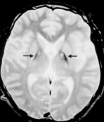 NBIA重要的影像学特征为双侧对称性基底节区病变,T2像低信号显示铁沉积。对称性累及基底节的疾病种类很多,中毒性(如甲醇、一氧化碳等)、代谢性(如肝硬化、高氨血症、低血糖、脑桥外髓鞘溶解、Wernicke脑病、Fahr病及Fahr综合征等)、遗传代谢性(如戊二酸血症1型、Leigh病等)、遗传变性病(肝豆状核变性、亨廷顿病等)。NBIA与这些疾病在影像学上的重要鉴别点是T2像低信号,而其他疾病在T2像上由于水肿、胶质增生等原因显示高信号。但是需要注意肝豆状核变性,在铜离子沉积严重或者采用高磁场MRI检查可以表现出均一的低信号或高低混杂信号,应注意鉴别。Fahr病及Fahr综合征双侧基底节对称性钙化病变也可在MRI显示低信号,CT扫描可显示高密度钙化病灶,予以排除。