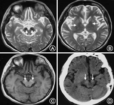 是以ATP7B为致病基因的常染色体隐性遗传性铜代谢障碍性疾病,好发于青少年。铜离子蓄积在脑、肝、肾、角膜等处,引起进行性加重的锥体外系症状(帕金森综合征、舞蹈症、手足徐动、步态异常、肌张力障碍等)、肝硬化、精神症状、肾损害及角膜色素环。实验室检查铜蓝蛋白水平降低。MRI在T2像显示高信号,在高磁场或铜离子沉积严重的病例,T2像可显示低信号或混杂信号。