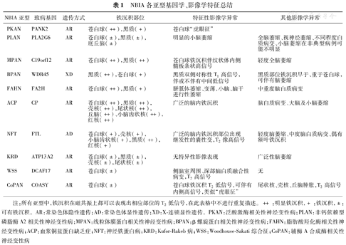 | NBIA亚型 | 致病基因 | 遗传方式 | 铁沉积部位 | 特征性影像学异常 | 其他影像学异常 |
