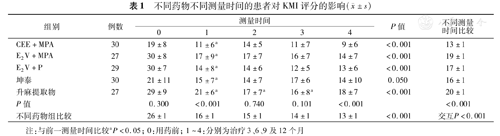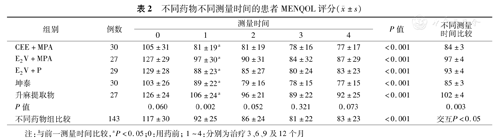 由表2可见,各个药物组之间MENQOL差异有统计学意义(P<0.01),CEE+MPA组最低,其次为坤泰组。多重比较得出,CEE+MPA组比升麻提取物组评分低,P<0.01,坤泰组比升麻提取物组评分低,P<0.01;药物因素与时间因素对患者的MENQOL存在交互作用(P<0.05)。从各个时间点来看,用药前各药物组差异无统计学意义,用药3个月各组差异有统计学意义(P<0.01),CEE+MPA组最低,用药6、9及12个月各个药物组差异无统计学意义。