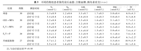 5个药物组服药前后血脂代谢和空腹血糖、胰岛素改变数据见表3,5组治疗前各指标比较差异无统计学意义,有可比性。CEE+MPA组FBG用药后比用药前降低,P<0.05;E2V+MPA组TC、LDL及FI用药后比用药前降低,P<0.05;E2V+P组FBG与FI用药后比用药前降低,P<0.05,表3。