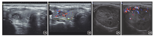 所有甲状腺髓样癌结节中93.1%(67/72)为实性,87.5%(63/72)低回声,69.4%(50/72)形态规整,76.4%(55/72)边界清晰,48.6%(35/72)有钙化(以微小钙化为主,62.9%),62.5%(45/72)纵横比(A/T)<1,57%内部有血流(血流丰富者为主,68.3%,28/41)(图1,图2)。55例患者有颈部淋巴结检查描述,40例发现颈部淋巴结肿大,最终术后病理证实为淋巴结转移者25例,超声诊断准确率62.5%(25/40)。