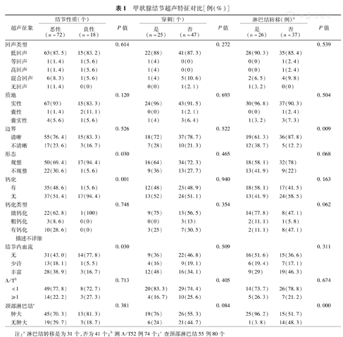 | 超声征象 | 结节性质(个) | P值 | 穿刺(个) | P值 | 淋巴结转移(例)a | P值 | |||||