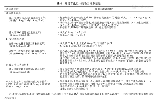 常用雾化吸入药物及推荐剂量见表4。