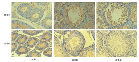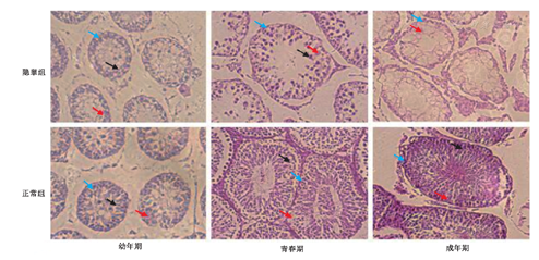 隐睾组幼年期,生精细胞和支持细胞较正常组减少,生精上皮细胞层变薄。隐睾组青春期及成年期,睾丸支持细胞形态异常,排列紊乱,生精上皮细胞变性坏死,生精小管萎缩(图1)。