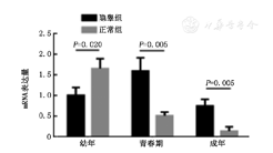 隐睾组幼年期、青春期和成年期ALDH1A1 mRNA表达量分别为1.01±0.19,1.60±0.32,0.75±0.16;正常组各期表达量分别为1.66±0.23,0.52±0.08,0.15±0.10,幼年期隐睾组睾丸组织中ALDH1A1 mRNA和蛋白的表达量低于正常组,青春期和成年期隐睾组睾丸组织中ALDH1A1 mRNA和蛋白的表达量高于正常组,差异有统计学意义(P<0.05)。