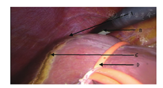 (1)常规全麻后,患者取仰卧位,建立气腹后调整患者体位至头高脚低位,可根据行左半肝或右半肝切除而选择向右侧或左侧倾斜30°体位。手术需要1名主刀医生与3名助手配合完成:主刀医生站在患者左侧,一助配合进行肝切除等操作,站在患者右侧,二助负责控制腹腔镜多功能手术解剖器(LPMOD),站在主刀右侧,三助扶镜,站在主刀左侧。(2)手术共需放置4~5个套管针(Trocar):脐下切口放置10 mm Trocar作为观察孔(A),右侧锁骨中线及腋前线切口放置5 mm Trocar作为辅助操作孔(C、D),根据手术部位确定合适位置做一切口放置12 mm Trocar作为主操作孔(B),右半肝切除选择剑突下1 cm,左半肝切除选择左肋缘下锁骨中线。建立肝后隧道进行绕肝提拉时于A、C之间加做切口放置12 mm Trocar为另外辅助操作孔(E)。