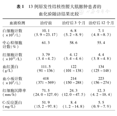 | 红细胞沉降率(mm/h) | 71.5(24.0~127.0) | 24.3(12.0~47.5) | 12.3(4.2~18.4) |