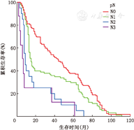 单因素分析显示,病变部位、肿瘤长度、pT分期、pN分期及LNR均对预后有影响。与传统预后因素相似,性别、年龄与预后差异均无统计学意义(均P>0.05)(表1)。pN分期、LNR生存曲线见图2,图3。