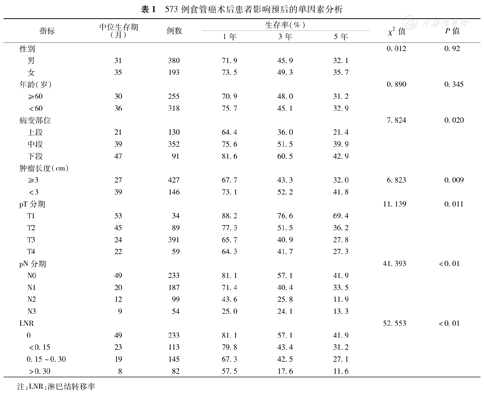 食管癌是临床常见恶性肿瘤,淋巴结转移数目(number of metastatic lymph node,pN)是影响食管癌预后的重要因素,而其受术中淋巴结清扫的影响,若检出不足则会直接影响患者预后的评估。一些研究已证实淋巴结转移率(metastatic lymph node ratio,LNR)对食管癌预后的评估价值[1,2]。本研究回顾性分析573例食管癌患者术后的临床病理资料并进一步细化N分期,提高其对预后评估的准确性。