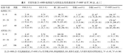 不同年龄21-OHD病例组与对照组女性性激素和17-OHP水平[M(Q1,Q3)]