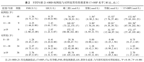 不同年龄病例组男性的孕酮和17-OHP水平也均明显高于对照组(均P<0.05),0~10岁、11~18岁和≥19岁男性病例组孕酮中位数分别为对照组的17.00、11.54和16.35倍,而17-OHP中位数分别为对照组的177.12,99.21和63.77倍。0~10岁、11~18岁组的睾酮和雌二醇水平也明显高于对照组(均P<0.05),男性不同年龄组的促性腺激素水平在两组间差异均无统计学意义(均P>0.05,表2)。