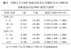 0~9岁、10~16岁和≥17岁女性及0~10岁、11~18岁和≥19岁男性受试者的孕酮与17-OHP水平相关性均有统计学意义,相关系数r分别为0.878、0.841、0.775、0.850、0.802和0.786(均P<0.001,表3)。
