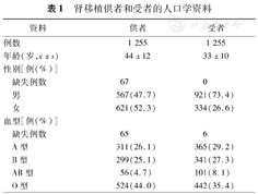 肾移植供者和受者的人口学资料见表1。供者的平均年龄为(44±12)岁,而受者的平均年龄为(33±10)岁。总体上,47.7%的供者是男性,而73.4%的受者是男性。