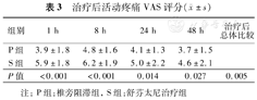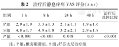 2.主要观察指标:P组患者治疗后1、8、24 h和48 h、静息和活动疼痛VAS评分明显低于S组(表2,表3)。