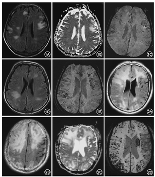 GRE或SWI序列发现皮质或皮质下多发微出血或脑表面铁沉积等出血征象是鉴别CAA-I与其他脑白质病的重要线索。本研究显示SWI对微出血灶的敏感性明显高于GRE序列,故在有条件的医院建议首选SWI寻找微出血证据。静息性急性缺血灶也是CAA患者的特征性影像表现之一,主要发生于皮质或皮质下白质,与Aβ沉积引起的微血管闭塞或灌注减低有关。