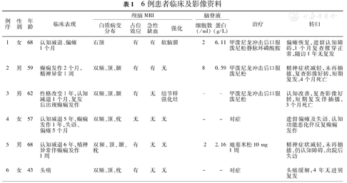 6例患者平均年龄59.5(43~68)岁,男女比例3∶3。1例单纯表现为头痛,其余5例均出现不同程度认知功能减退,其中4例伴有癫痫发作,2例出现偏瘫、失语等局灶性神经功能缺损,2例合并精神症状。