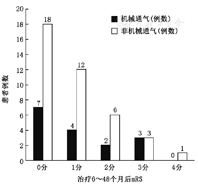 应用SPSS 19.0软件包进行数据录入和统计学分析。计量资料数据采用t检验,计数资料数据采用行×列Fisher精确性检验或χ2检验。比较机械通气组和非机械通气组患者临床资料、辅助检查、治疗方法和预后等指标之间有无显著性差异。并比较机械通气组不同预后患者呼吸机使用时间差异有无统计学意义。P<0.05为差异有统计学意义。