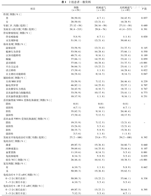 56例抗NMDAR脑炎患者机械通气组16例(28.6%)、非机械通气组40例(71.4%)。两组患者比较:性别、伴有畸胎瘤、出现意识障碍、语言障碍、自主神经功能障碍、免疫治疗方法、收住NCU等项目在两组间差异有统计学意义。与非机械通气组的患者相比,机械通气组性别为女性、伴有畸胎瘤、出现意识障碍、自主神经功能障碍、接受血浆置换术、免疫抑制剂治疗、收住NCU的比例更高,而语言障碍患者少于非机械通气组。