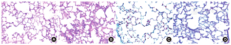 肺纤维化组羟脯氨酸含量为(1.516±0.339)μg/mg,显著高于正常对照组的(0.543±0.194)μg/mg(P<0.05)。正常对照组肺组织结构完整、清晰,无异常病理改变(图1A);肺纤维化组局部肺泡结构破坏,肺泡间隔增厚,组织胶原纤维增生较明显(图1B)。Masson染色显示肺纤维化组蓝色的胶原纤维较正常对照组明显增多,肺间质明显增厚(图1C,图1D)。两组大鼠肺纤维化评分分布情况见表1。