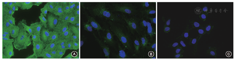 免疫荧光染色法测定显示:无支架对照组A549细胞α-SMA表达呈阳性,正常支架组与纤维化支架组A549细胞α-SMA表达均不明显,呈弱阳性;正常支架组与纤维化支架组A549细胞α-SMA蛋白荧光表达均显著低于无支架对照组(均P<0.05),其中纤维化支架组显著低于正常支架组(P<0.05);正常支架组与纤维化支架组细胞α-SMA的mRNA表达均显著低于无支架对照组(均P<0.05),其中纤维化支架组显著低于正常支架组(P<0.05)(图3,表3)。