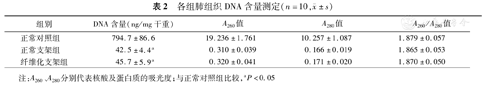 HE染色显示正常和纤维化肺组织去细胞后,肺支架呈"蜂窝状"结构,正常支架组与纤维化支架组去细胞支架上均未见明显残留细胞及细胞核结构(图2)。基因组DNA浓度分析显示两组去细胞肺支架DNA浓度均显著低于正常对照组未去细胞的肺组织(P<0.01),各组提取的DNA标本A260/A280比值在1.8~2.0,表明标本DNA纯度较高(表2)。