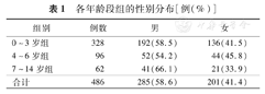 486例患儿中男285例,女201例;年龄0~14岁,平均(3.4±2.8)岁,其中0~3岁组、4~6岁组、7~14岁组各有328例、96例、62例,分别占67.5%、19.7%、12.8%;各年龄段组性别比例差异无统计学意义(χ2=2.227,P=0.320)(表1)。