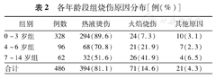 | 组别 | 例数 | 热液烫伤 | 火焰烧伤 | 其他原因 |
