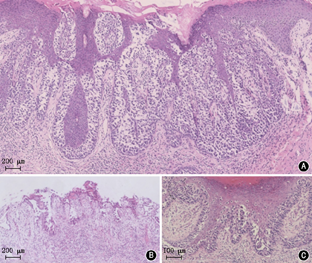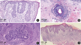 根据本研究中AEMPD不同的棘层松解模式,结合相关文献[11,12],进一步将22例AEMPD分为3个亚型,即Hailey-Hailey病型AEMPD(n=17,占77.3%)(图2A),寻常型天疱疮型AEMPD(n=3,占13.6%)(图2B),Darier病型AEMPD(n=1,占4.5%)(图2C),另有1例(4.5%)同时出现Darier病型和寻常型天疱疮型棘层松解。