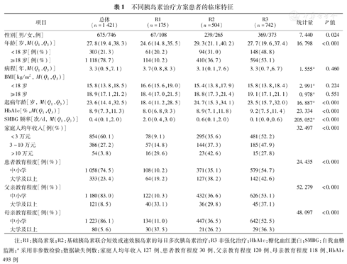 注:R1:胰岛素泵;R2:基础胰岛素联合短效或速效胰岛素的每日多次胰岛素治疗;R3非强化治疗;HbA1c:糖化血红蛋白;SMBG:自我血糖监测;a采用非参数检验;数据缺失例数:家庭人均年收入127例、患者教育程度30例、父亲教育程度120例、母亲教育程度118例、HbA1c 493例