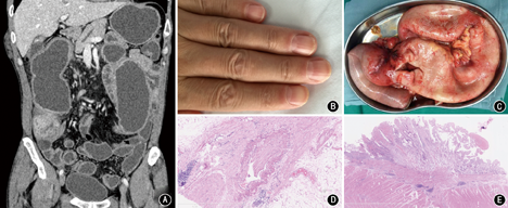 患者男,50岁,因"腹胀、腹泻1年余"入院。2014年12月出现进食后腹胀,排气、排便后缓解,发作频率及程度逐渐加重;间断腹泻,每周1~2 d,每日糊样便3~5次,伴纳差。2015年4月外院查血红蛋白110 g/L,白细胞、血小板正常,粪便潜血阳性,血白蛋白23.6 g/L,红细胞沉降率23 mm/1 h,C反应蛋白15.7 mg/L;抗核抗体阳性(着丝点型,1∶320)。全消化道造影示小肠多处节段性狭窄,回肠近段明显扩张。腹部增强CT示结肠壁稍增厚。胃镜示浅表性胃炎。结肠镜未见异常。考虑"炎症性肠病" ,予甲泼尼龙每日40 mg,羟氯喹0.2 g每日2次及营养支持治疗,腹胀症状减轻,腹泻无变化。出院后甲泼尼龙规律减量至每日8 mg时维持,腹胀再次加重。2015年12月外院查红细胞沉降率24 mm/1 h,C反应蛋白8.82 mg/L;小肠镜示回肠中上段不规则肿块,表面溃疡,部分黏膜暗红色隆起,回肠中段隆起;活检病理示(回肠中上段)黏膜慢性炎伴糜烂。予甲泼尼龙每日8 mg维持,沙利度胺每日25 mg,硫唑嘌呤每日50 mg,羟氯喹0.2 g每日2次,症状无缓解。发病以来体重减轻10 kg。患者于2016年2月起出现对称性关节疼痛(掌指关节、近端指间关节、肘关节、肩关节、踝关节),手指皮肤紧绷,加用激素后减轻。既往史及个人史:1987至1995年接触化工产品(硫酸、氢氧化钠等);吸烟20余年,10支/d,已戒1年余。家族史:母亲因"淋巴瘤"去世。入院查体:消瘦,前胸壁三处毛细血管扩张,压之可褪色,双手指端甲周红斑(图1),无明显肢端皮肤变硬、钙质沉着,心肺查体无特殊,全腹膨隆,可见肠型及蠕动波,无压痛、反跳痛,肠鸣音亢进。入院查血红蛋白85 g/L,平均红细胞体积86.9 fl,血清铁2.8 μmol/L,总铁结合力49.8 μmol/L,铁蛋白12 μg/L,转铁蛋白饱和度5.0%,血白蛋白34 g/L,红细胞沉降率55 mm/1 h,超敏C反应蛋白34.38 mg/L,血结核感染T细胞斑点试验阴性,多次查抗着丝点抗体阳性(1∶320~1∶640)。食管测压:上食管括约肌松弛功能障碍,余未见明显异常。腹盆增强CT+小肠重建示小肠多发节段性肠壁增厚,右侧腹部回肠肠壁团块样增厚,病变近端肠管不全梗阻性改变,腹膜后淋巴结肿大(图1)。PET/CT示右中腹部回肠局部增厚,代谢异常增高灶(病灶标准化摄取值的最大值为8.4),余二处小肠肠壁局限性增厚,代谢增高。胃镜示反流性食管炎(洛杉矶分型A型)。结肠镜未见明显异常。经基本外科、免疫科和放射科多科会诊,考虑小肠占位性质不明、恶性不除外,合并不全肠梗阻,有手术指征。于5月31日全麻下行腹腔镜探查、粘连松解、回肠部分切除术,术中见距盲肠70~80 cm处回肠肠壁明显增厚,颜色暗红,质地韧,占位感明显,其近段小肠扩张,最宽处肠管直径约6 cm(图1)。术后病理回报:大体所见肠管长55 cm,距一断端1、11、26、29 cm处分别见肠管狭窄,黏膜皱襞消失,距一断端36 cm、距另一断端13 cm处可见一隆起型占位,面积5 cm×4 cm,高出周围1 cm,肠腔显著狭窄,切面灰白、实性、质中,该隆起型占位至一侧断端肠腔显著扩张、肠壁变薄,厚0.2 cm。病理诊断:(部分回肠)小肠壁组织急慢性炎,溃疡形成,破坏肠壁肌层伴纤维组织增生及周边黏膜炎性息肉形成,肠壁各层均可见较多淋巴细胞浆细胞浸润伴淋巴滤泡形成,多处黏膜糜烂伴深达肌层的窦道形成,肠系膜血管扩张并可见炎细胞浸润,两侧断端未见特殊,病变周围纤维组织增生明显,弹力纤维(+),符合缺血性肠病改变(图1)。术后出现吻合口瘘、感染性休克,遂于全麻下急诊行剖腹探查、粘连松解、回肠部分切除术。术后抗感染治疗,并加用琥珀酸氢化可的松每日150 mg,饮食过渡至流食联合肠内营养,未再出现腹胀,后激素改为甲泼尼龙每日16 mg。手术1个月后加用硫唑嘌呤1.5 mg·kg-1·d-1。患者病情稳定,皮肤紧绷感及甲周红斑改善,监测血常规、肝肾功、红细胞沉降率、超敏C反应蛋白均正常。最后诊断:CREST综合征消化道受累,不全肠梗阻,反流性食管炎。