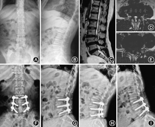 术后卧床,48~72 h内拔除伤口引流管,硬板床制动。术后X线见内固定位置及形态良好后。术后5 d腰围保护下下地活动并避免长时间坐位休息,同时应用传统抗炎止痛药物和神经营养药辅助。1周后指导下渐进的床上腰背肌肉功能恢复训练。